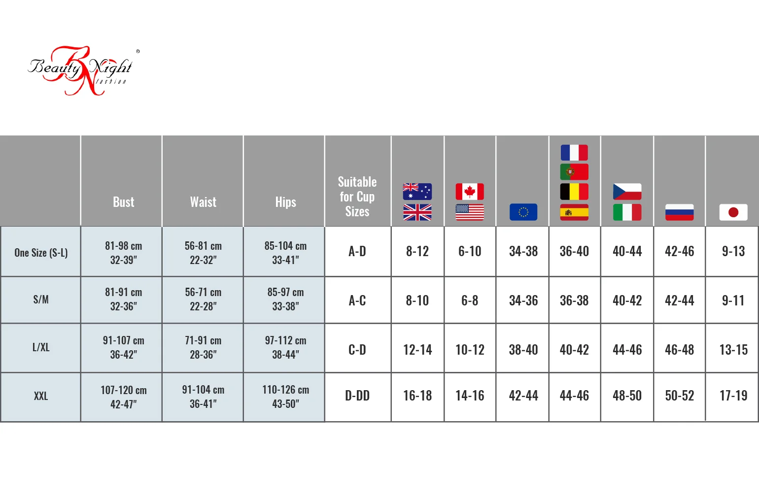 | Size | S/M, L/XL, XXL/XXXL |
