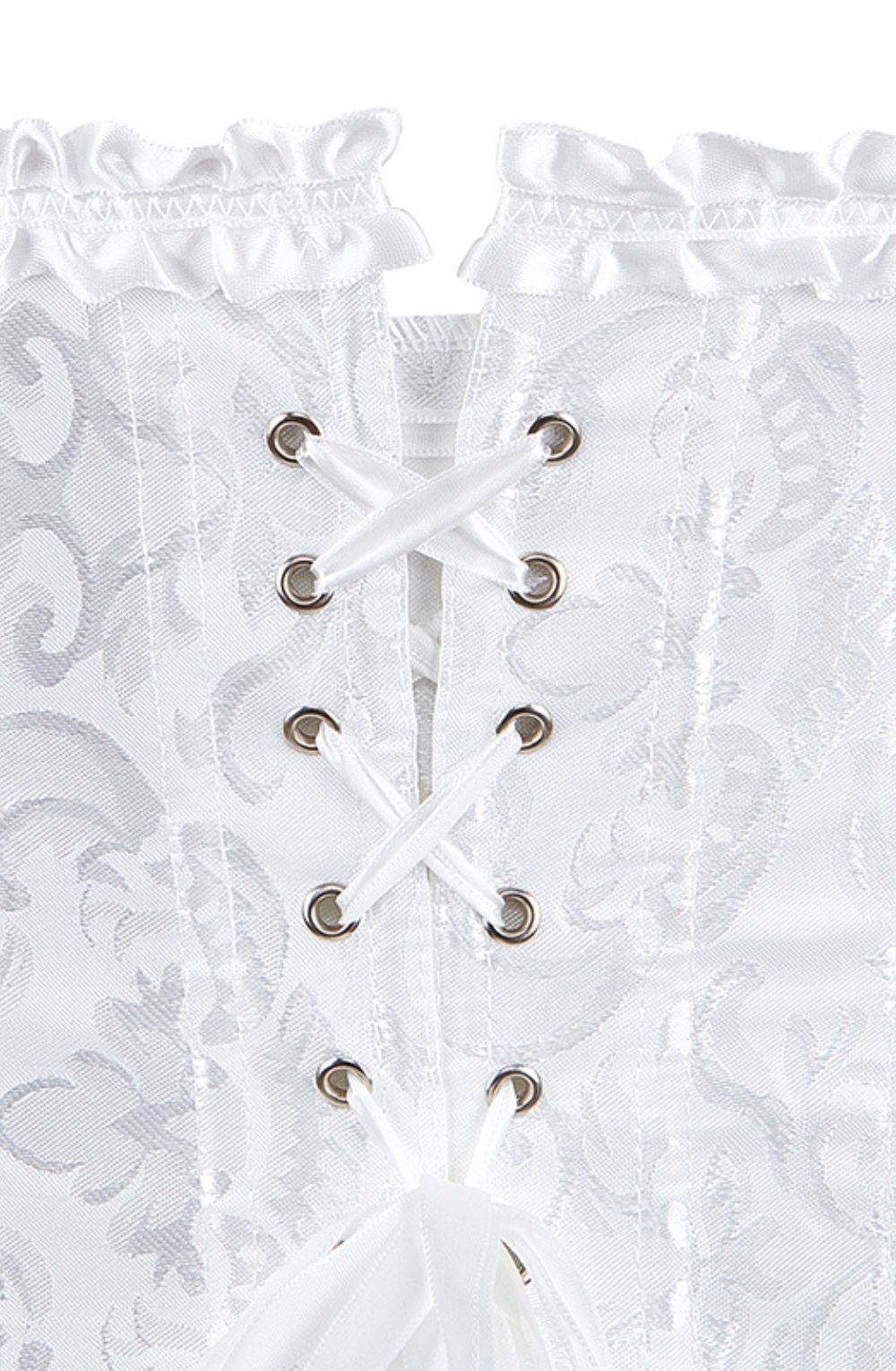 Add a touch of timeless elegance with this stunning white brocade corset, featuring intricate floral patterns, satin ribbon accents, and soft ruffle trim. Designed to flatter your curves, this structured corset includes a front busk fastening and a lace-up back for adjustable shaping. Ideal for bridal lingerie, burlesque styling, or elegant eveningwear.